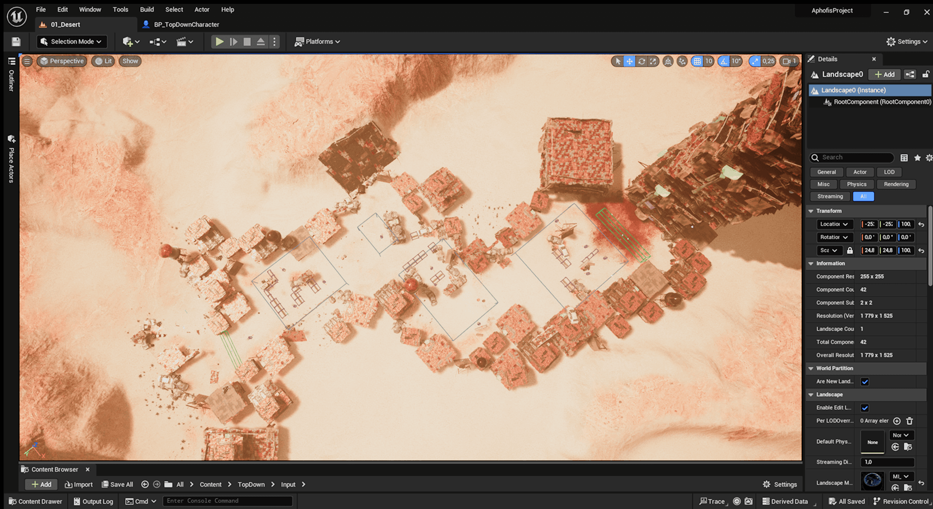 Se creó un entorno completo utilizando herramientas de modelado de paisajes, iluminación dinámica y materiales optimizados con Nanite.